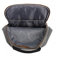 Mochila gris + marrón con 1 compartimento principal con cierre, 1 bolsillo frontal con cierre y dos bolsillos laterales. El compartimento principal incluye un bolsillo acolchado para portátil hasta 15.6" y un bolsillo interior con cierre velcro.